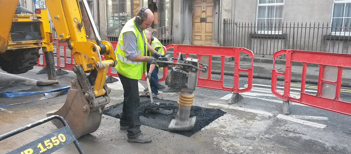 This application at the junction of Gladstone Street and Kickham Street in Clonmel, Ireland was 2.5 square meters with a depth of 200 mm requiring 3 lifts of EZ Street cold asphalt. There was a burst water main, excavation and immediate reinstatement. A wacker plate was used to compact the EZ Street cold asphalt. The repair was completed by the Clonmel Corporation on September 28. EZ Street was used because it was an emergency, and the reinstatement had to take place immediately and there was no hot asphalt available. The EZ Street asphalt is really holding up well, we will post more pictures within the next few weeks to show the success of the application.